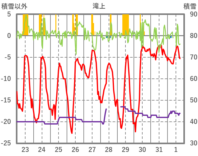 | 日 | 時 | 気温 | 降水 | 風向/風速 | 日照 | 積雪 | 降雪 |
