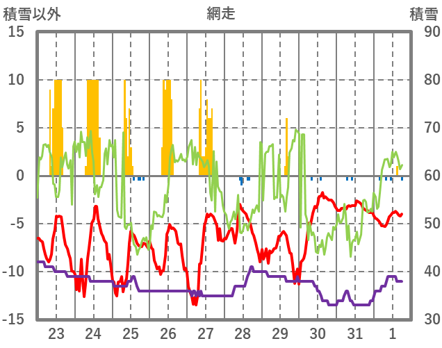 | 日 | 時 | 気温 | 降水 | 風向/風速 | 日照 | 積雪 | 降雪 |