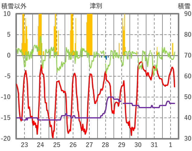 | 日 | 時 | 気温 | 降水 | 風向/風速 | 日照 | 積雪 | 降雪 |