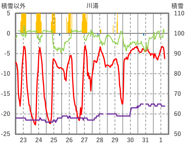 | 日 | 時 | 気温 | 降水 | 風向/風速 | 日照 | 積雪 | 降雪 |