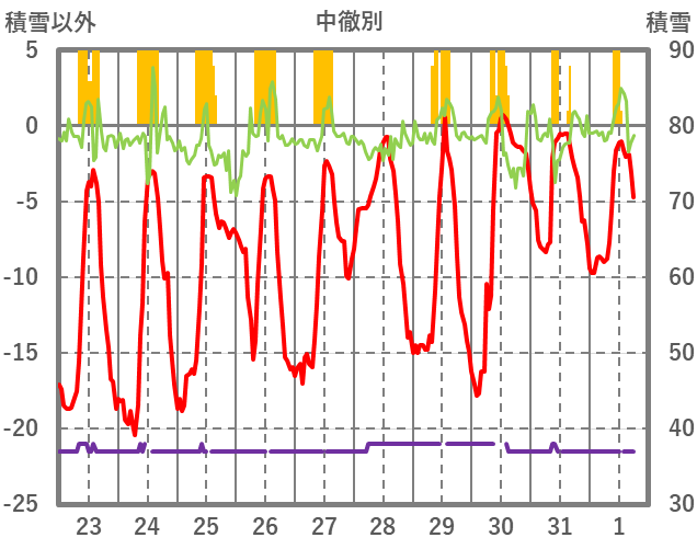 | 日 | 時 | 気温 | 降水 | 風向/風速 | 日照 | 積雪 | 降雪 |