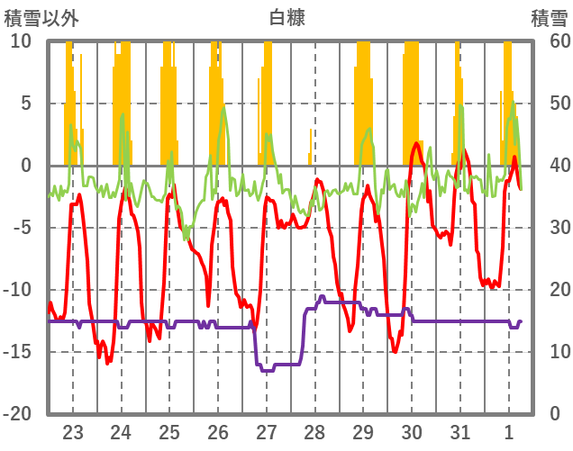 | 日 | 時 | 気温 | 降水 | 風向/風速 | 日照 | 積雪 | 降雪 |