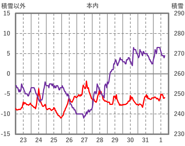 | 日 | 時 | 気温 | 降水 | 風向/風速 | 日照 | 積雪 | 降雪 |
