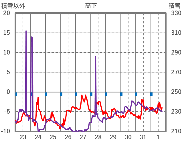 | 日 | 時 | 気温 | 降水 | 風向/風速 | 日照 | 積雪 | 降雪 |