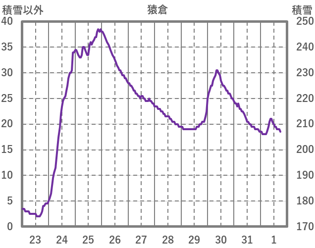 | 日 | 時 | 気温 | 降水 | 風向/風速 | 日照 | 積雪 | 降雪 |