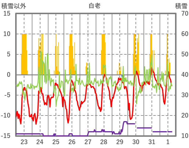 | 日 | 時 | 気温 | 降水 | 風向/風速 | 日照 | 積雪 | 降雪 |