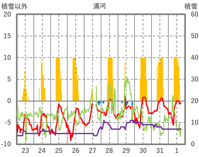 | 日 | 時 | 気温 | 降水 | 風向/風速 | 日照 | 積雪 | 降雪 |