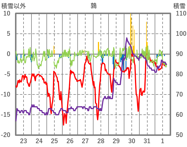 | 日 | 時 | 気温 | 降水 | 風向/風速 | 日照 | 積雪 | 降雪 |