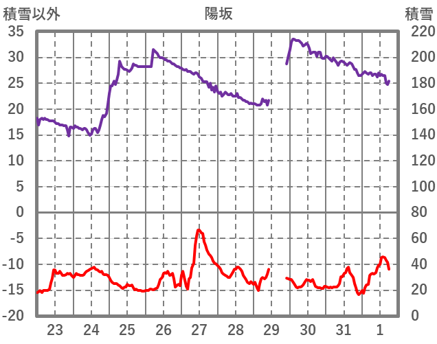 | 日 | 時 | 気温 | 降水 | 風向/風速 | 日照 | 積雪 | 降雪 |
