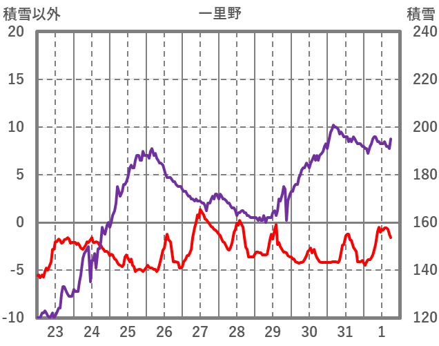 | 日 | 時 | 気温 | 降水 | 風向/風速 | 日照 | 積雪 | 降雪 |