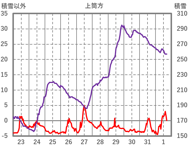 | 日 | 時 | 気温 | 降水 | 風向/風速 | 日照 | 積雪 | 降雪 |