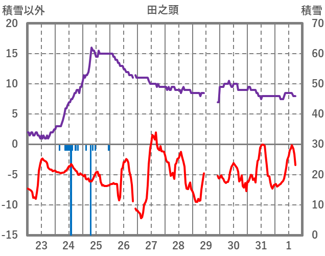 | 日 | 時 | 気温 | 降水 | 風向/風速 | 日照 | 積雪 | 降雪 |