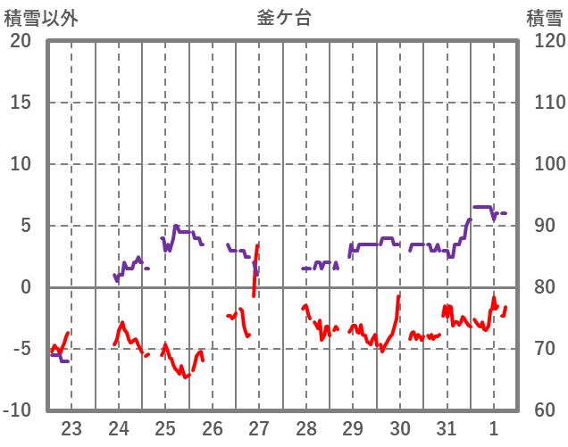 | 日 | 時 | 気温 | 降水 | 風向/風速 | 日照 | 積雪 | 降雪 |