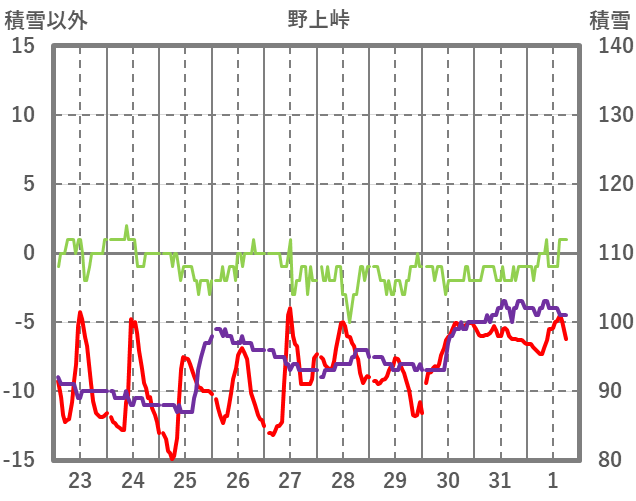 | 日 | 時 | 気温 | 降水 | 風向/風速 | 日照 | 積雪 | 降雪 |