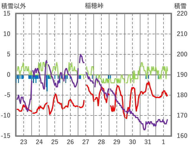 | 日 | 時 | 気温 | 降水 | 風向/風速 | 日照 | 積雪 | 降雪 |