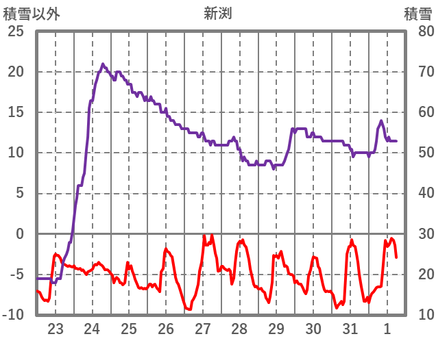 | 日 | 時 | 気温 | 降水 | 風向/風速 | 日照 | 積雪 | 降雪 |