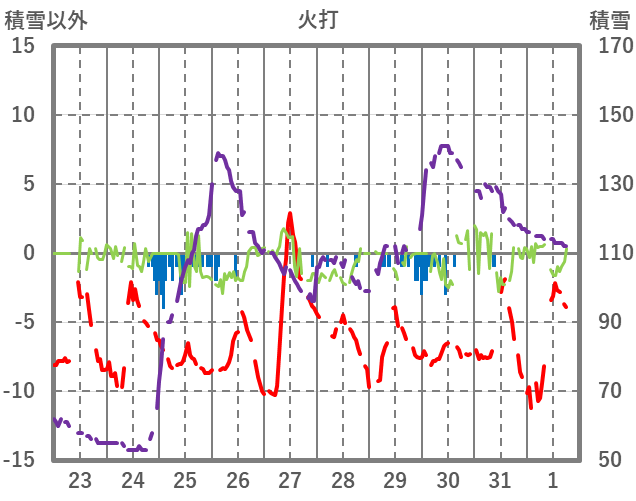 | 日 | 時 | 気温 | 降水 | 風向/風速 | 日照 | 積雪 | 降雪 |