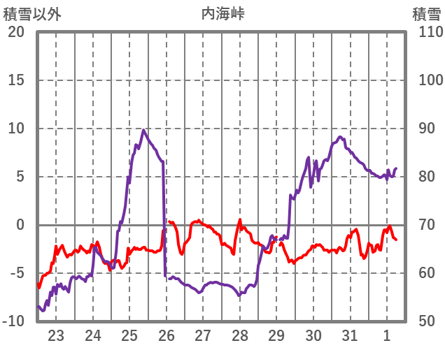 | 日 | 時 | 気温 | 降水 | 風向/風速 | 日照 | 積雪 | 降雪 |
