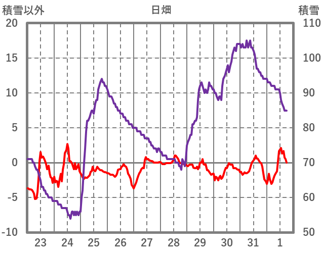 | 日 | 時 | 気温 | 降水 | 風向/風速 | 日照 | 積雪 | 降雪 |