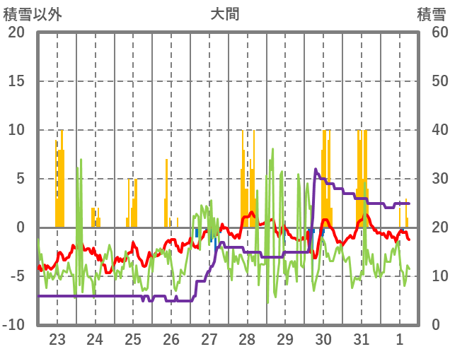 | 日 | 時 | 気温 | 降水 | 風向/風速 | 日照 | 積雪 | 降雪 |
