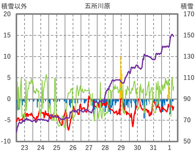 | 日 | 時 | 気温 | 降水 | 風向/風速 | 日照 | 積雪 | 降雪 |