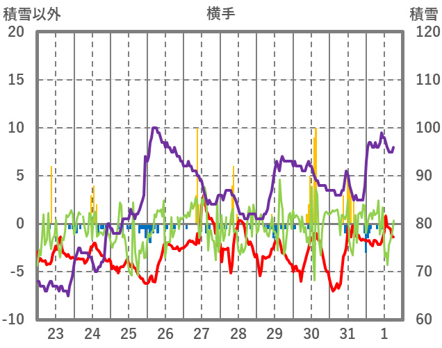 | 日 | 時 | 気温 | 降水 | 風向/風速 | 日照 | 積雪 | 降雪 |
