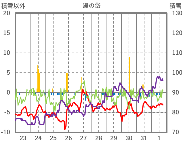 | 日 | 時 | 気温 | 降水 | 風向/風速 | 日照 | 積雪 | 降雪 |