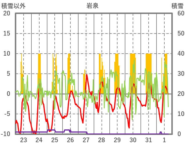 | 日 | 時 | 気温 | 降水 | 風向/風速 | 日照 | 積雪 | 降雪 |