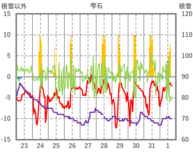 | 日 | 時 | 気温 | 降水 | 風向/風速 | 日照 | 積雪 | 降雪 |