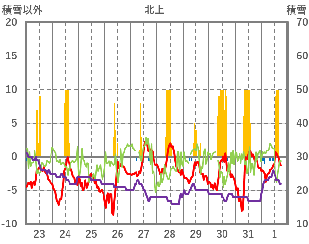 | 日 | 時 | 気温 | 降水 | 風向/風速 | 日照 | 積雪 | 降雪 |