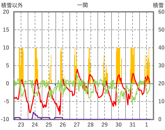| 日 | 時 | 気温 | 降水 | 風向/風速 | 日照 | 積雪 | 降雪 |