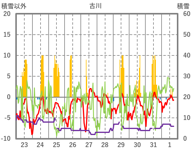 | 日 | 時 | 気温 | 降水 | 風向/風速 | 日照 | 積雪 | 降雪 |