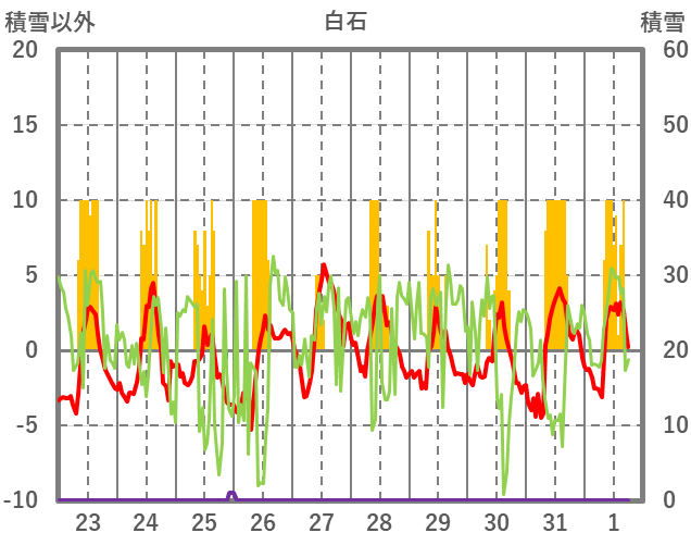 | 日 | 時 | 気温 | 降水 | 風向/風速 | 日照 | 積雪 | 降雪 |