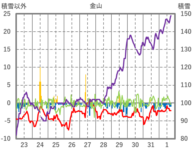 | 日 | 時 | 気温 | 降水 | 風向/風速 | 日照 | 積雪 | 降雪 |