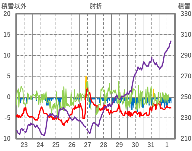 | 日 | 時 | 気温 | 降水 | 風向/風速 | 日照 | 積雪 | 降雪 |