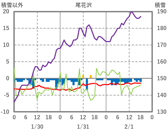 | 日 | 時 | 気温 | 降水 | 風向/風速 | 日照 | 積雪 | 降雪 |