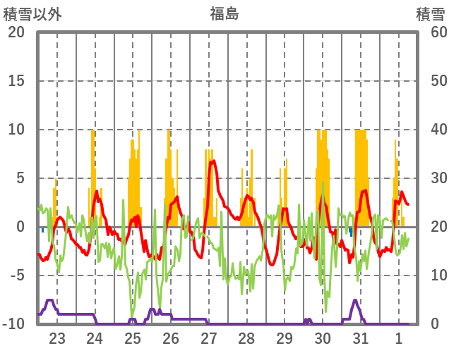 | 日 | 時 | 気温 | 降水 | 風向/風速 | 日照 | 積雪 | 降雪 |