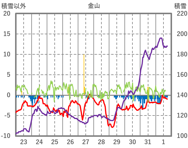 | 日 | 時 | 気温 | 降水 | 風向/風速 | 日照 | 積雪 | 降雪 |