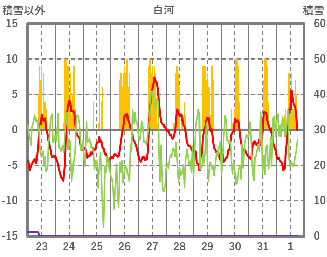 | 日 | 時 | 気温 | 降水 | 風向/風速 | 日照 | 積雪 | 降雪 |