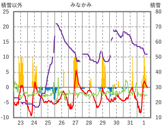 | 日 | 時 | 気温 | 降水 | 風向/風速 | 日照 | 積雪 | 降雪 |