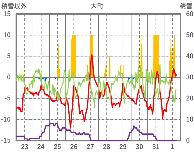 | 日 | 時 | 気温 | 降水 | 風向/風速 | 日照 | 積雪 | 降雪 |
