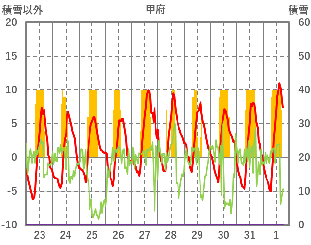 | 日 | 時 | 気温 | 降水 | 風向/風速 | 日照 | 積雪 | 降雪 |