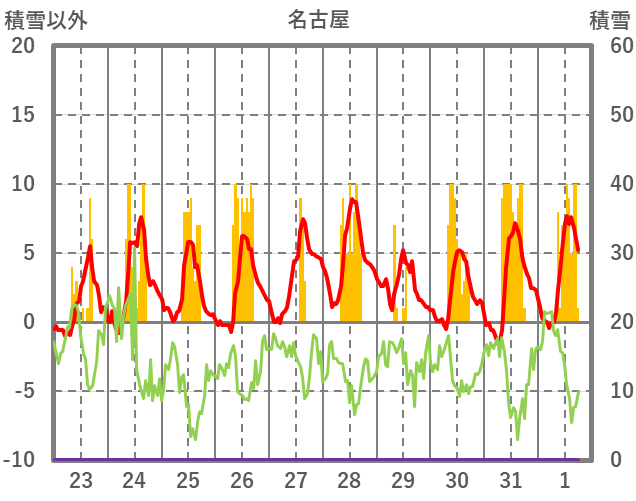 | 日 | 時 | 気温 | 降水 | 風向/風速 | 日照 | 積雪 | 降雪 |
