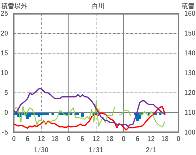 | 日 | 時 | 気温 | 降水 | 風向/風速 | 日照 | 積雪 | 降雪 |