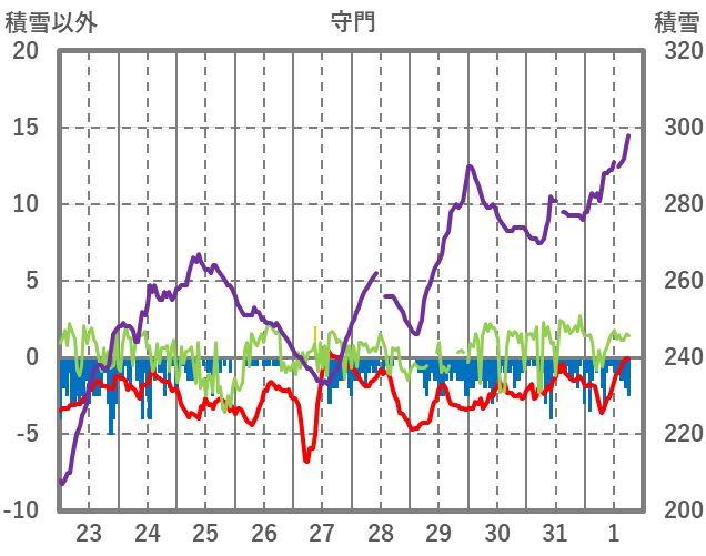 | 日 | 時 | 気温 | 降水 | 風向/風速 | 日照 | 積雪 | 降雪 |