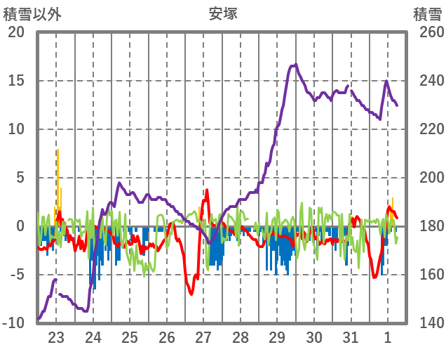 | 日 | 時 | 気温 | 降水 | 風向/風速 | 日照 | 積雪 | 降雪 |