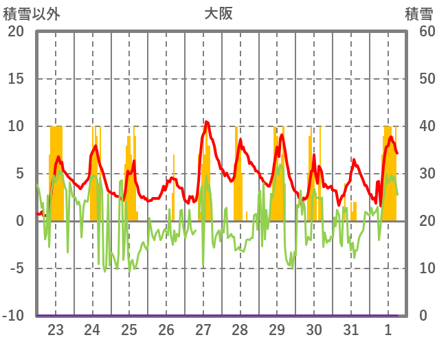| 日 | 時 | 気温 | 降水 | 風向/風速 | 日照 | 積雪 | 降雪 |
