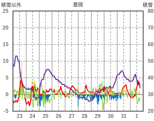 | 日 | 時 | 気温 | 降水 | 風向/風速 | 日照 | 積雪 | 降雪 |