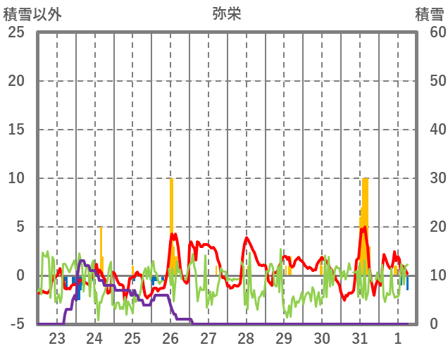 | 日 | 時 | 気温 | 降水 | 風向/風速 | 日照 | 積雪 | 降雪 |
