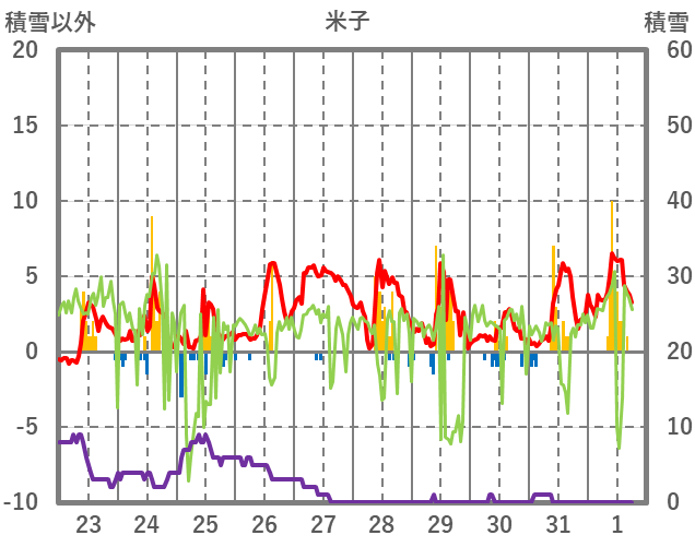 | 日 | 時 | 気温 | 降水 | 風向/風速 | 日照 | 積雪 | 降雪 |